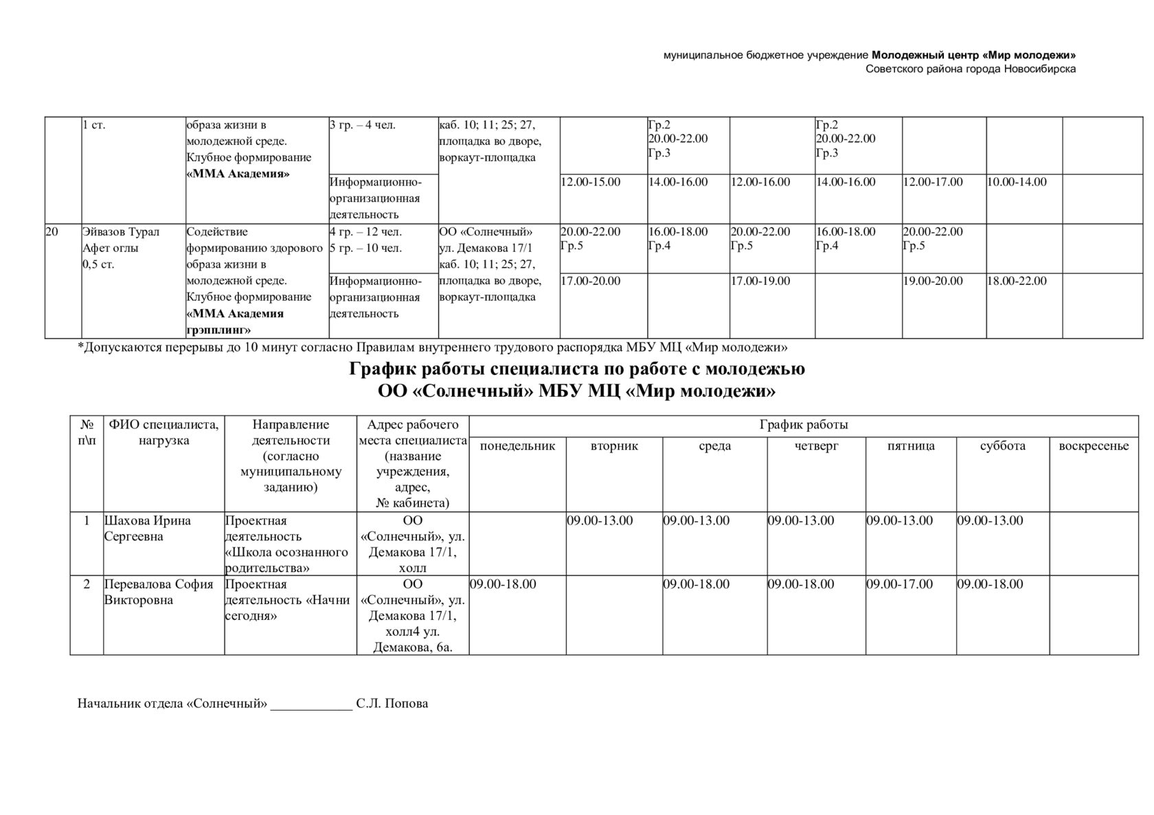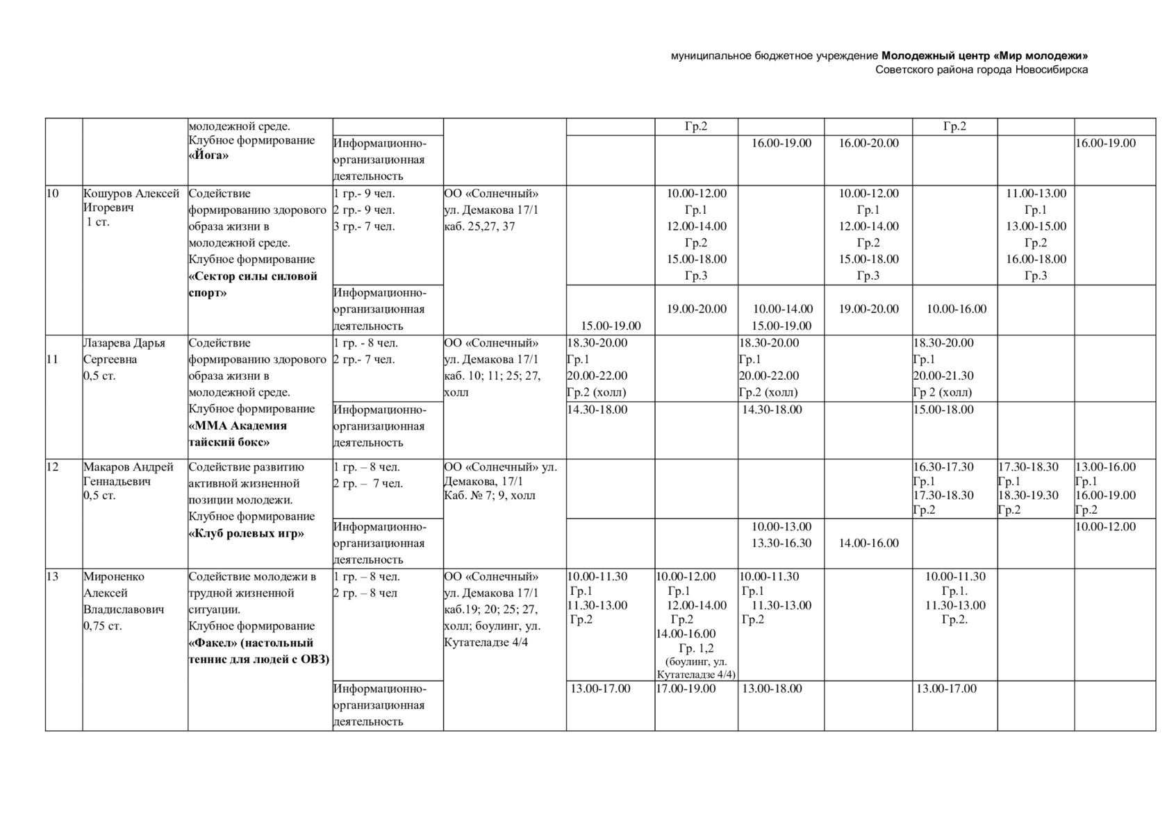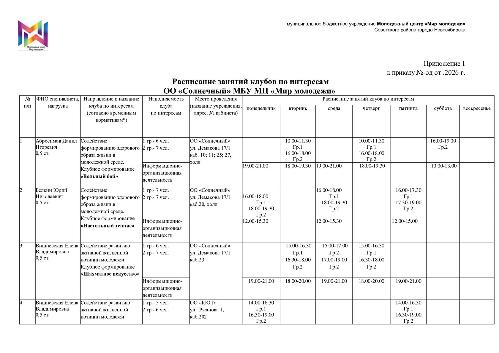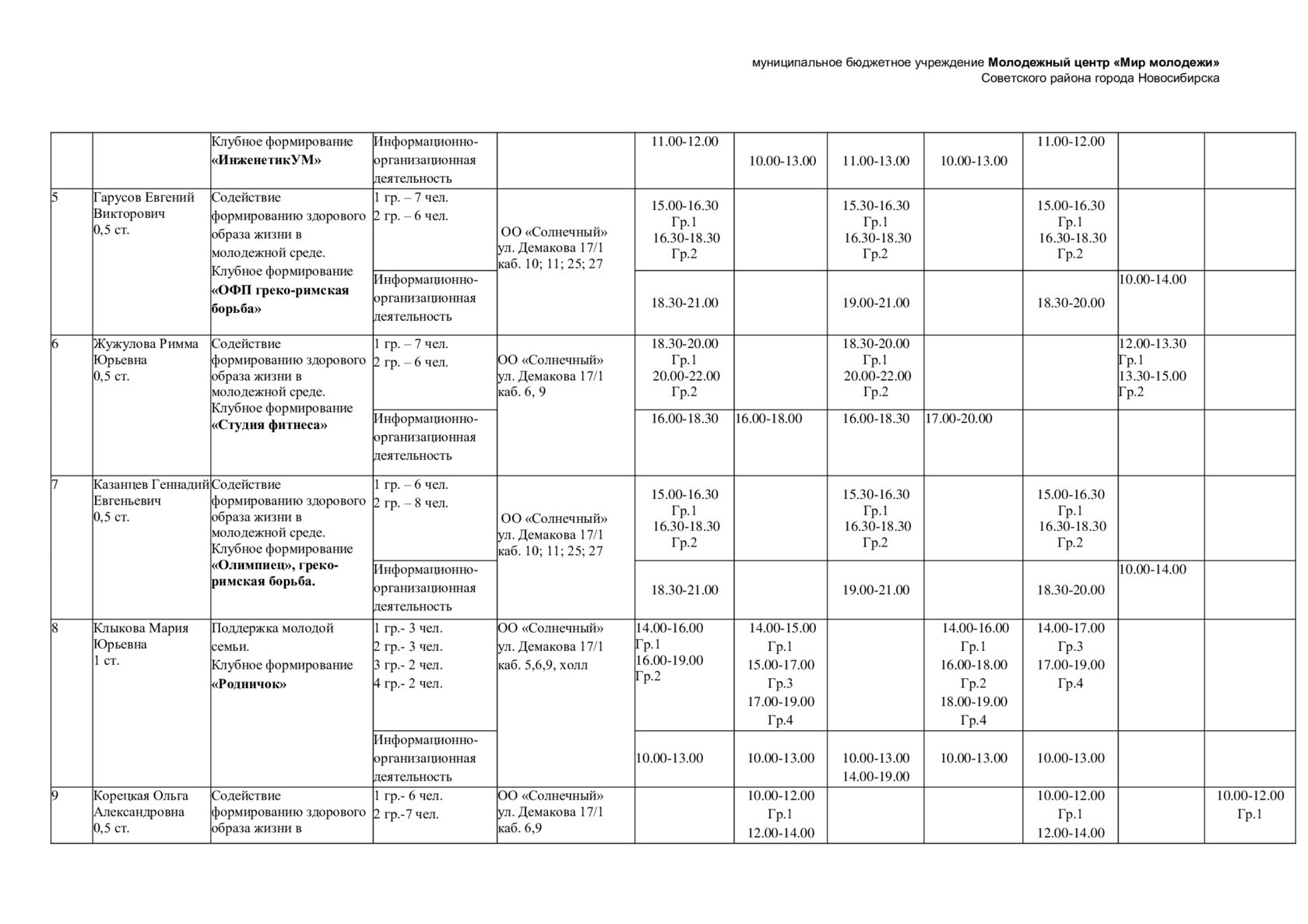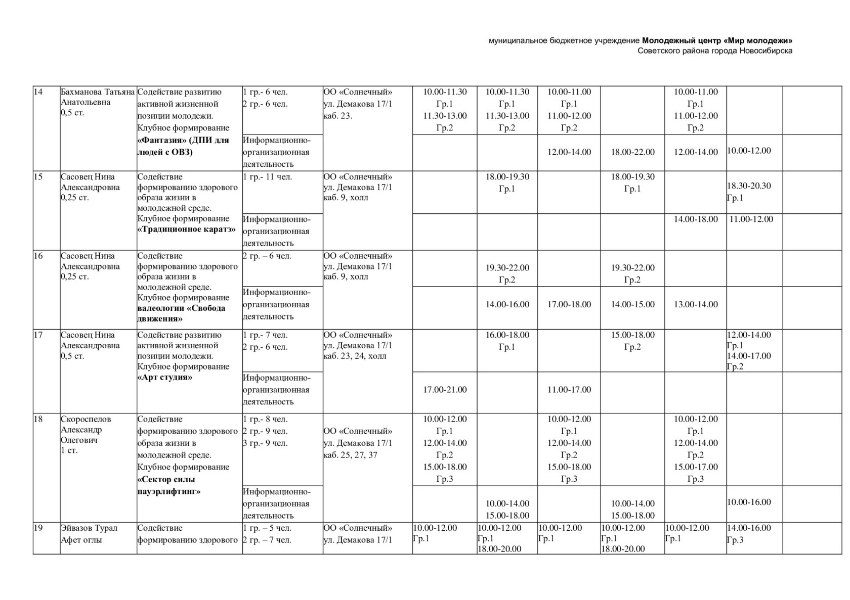 Расписание отдела "Солнечный"