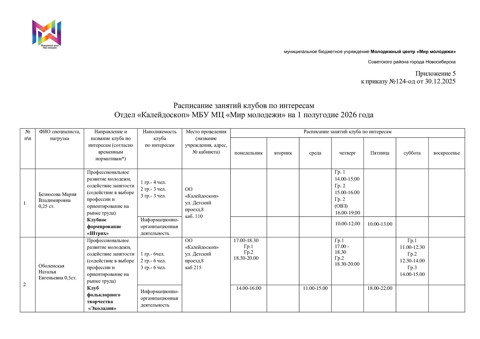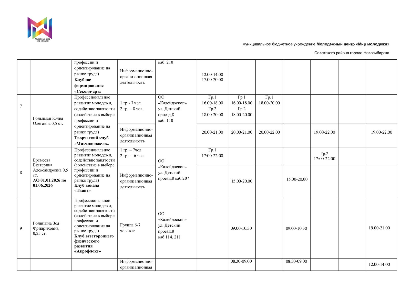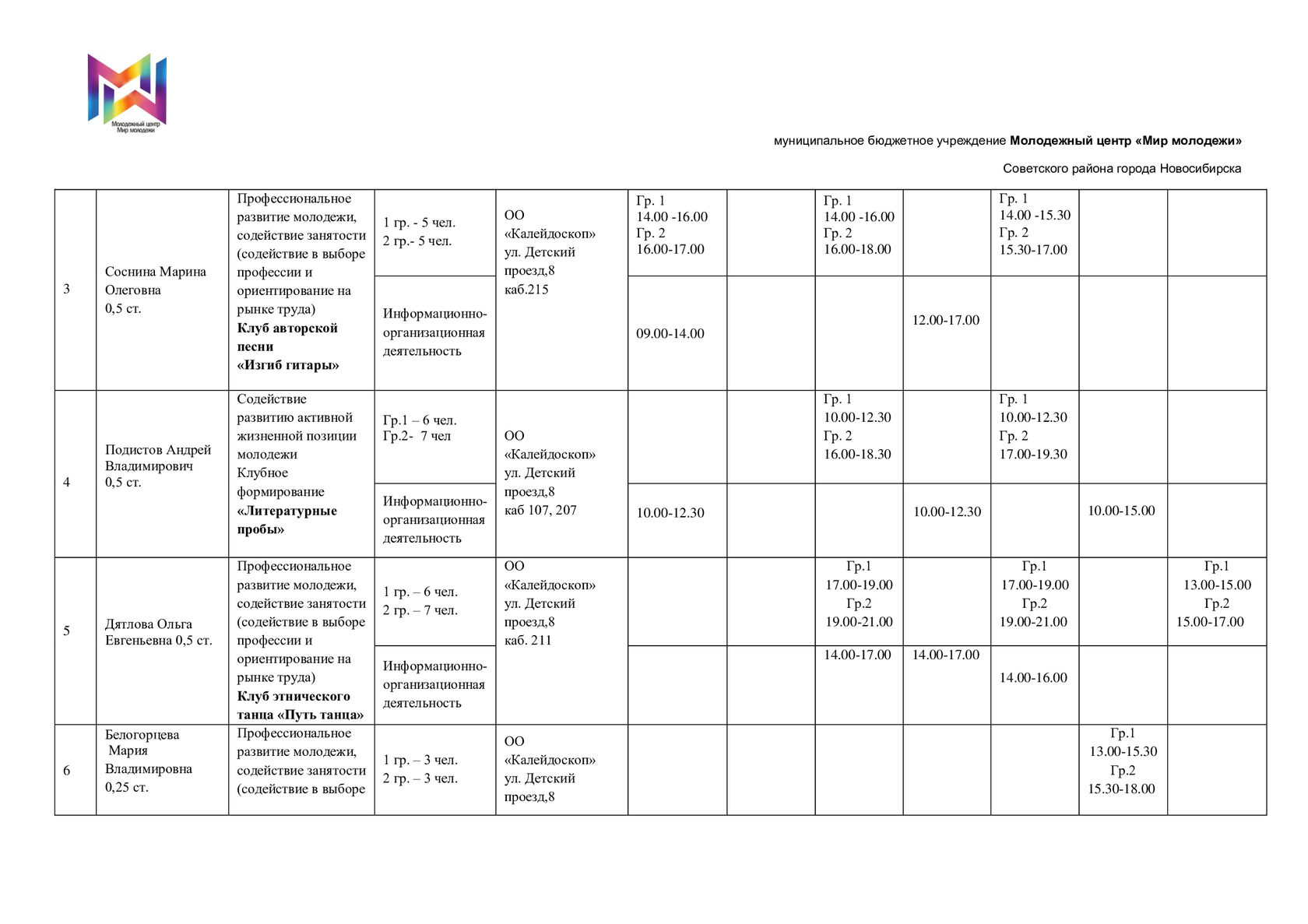 Расписание отдела "Калейдоскоп"