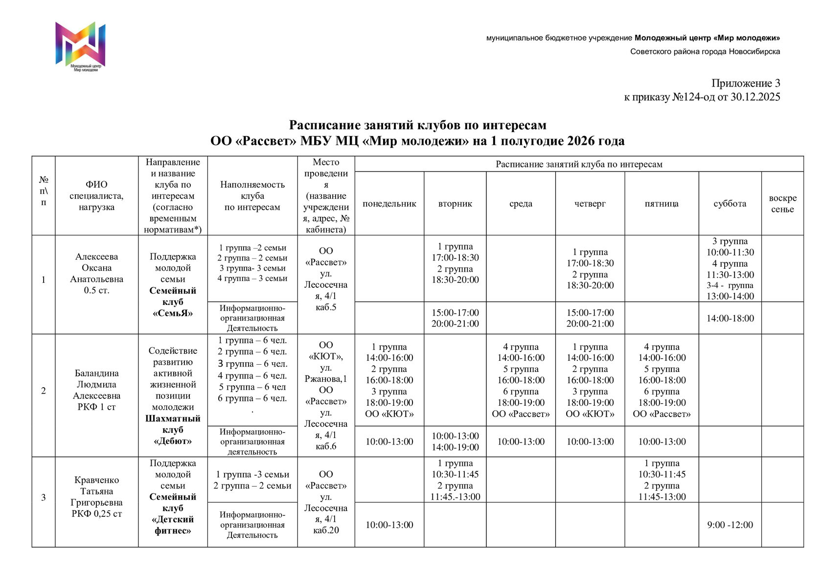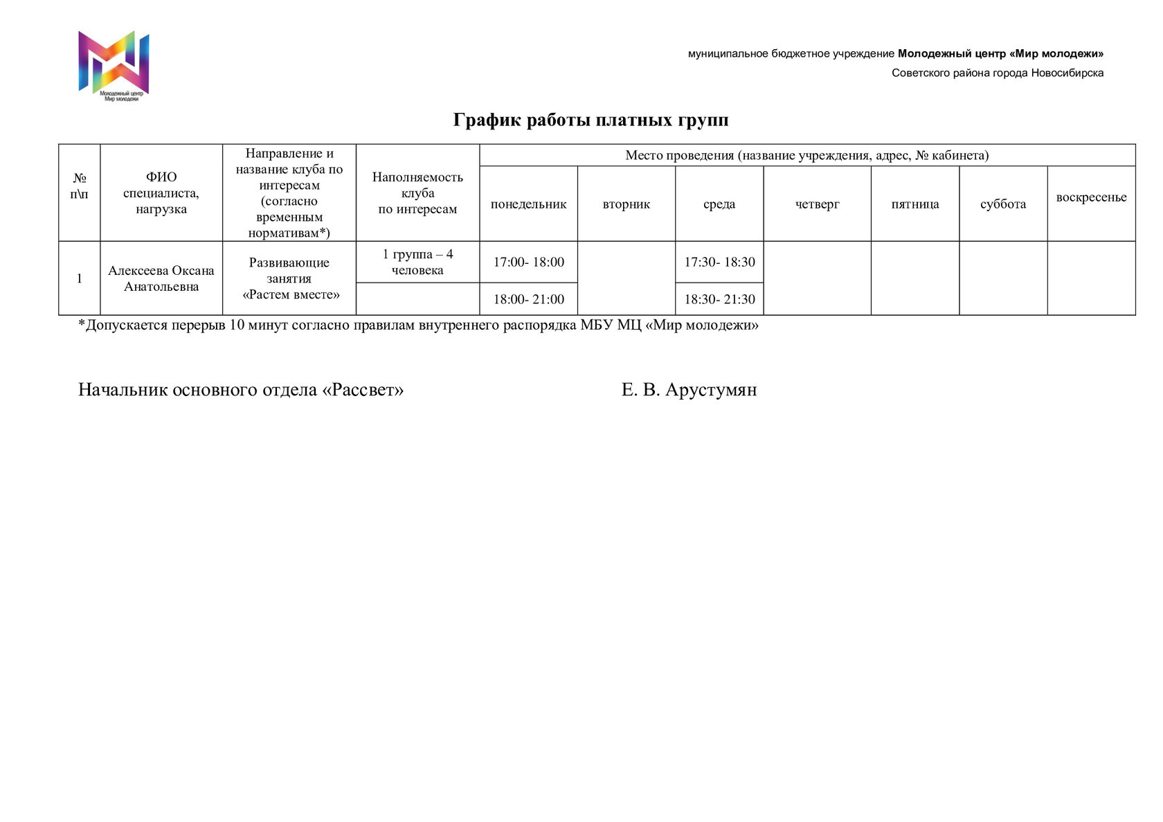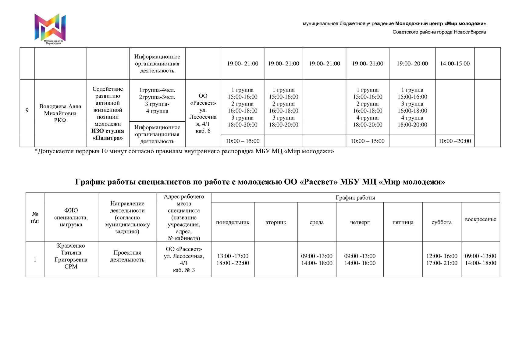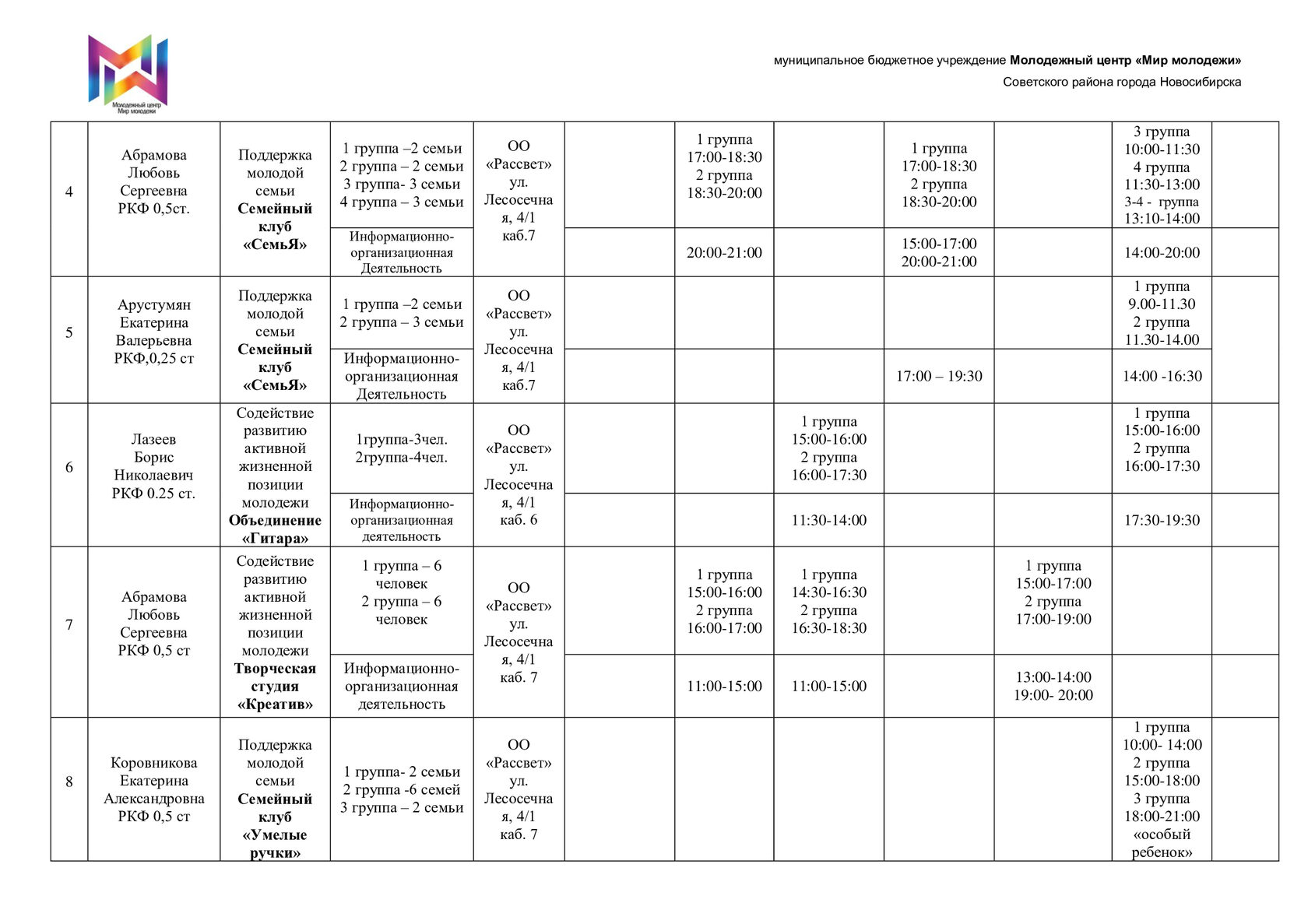Расписание отдела "Рассвет"