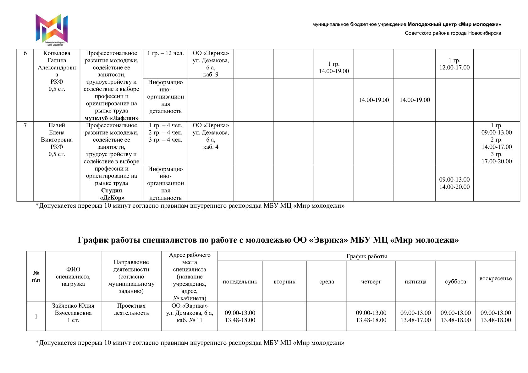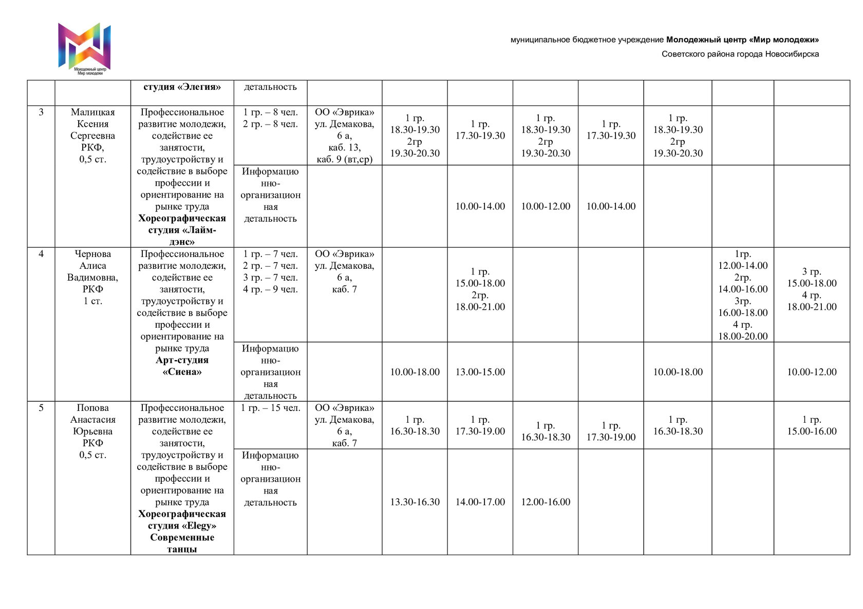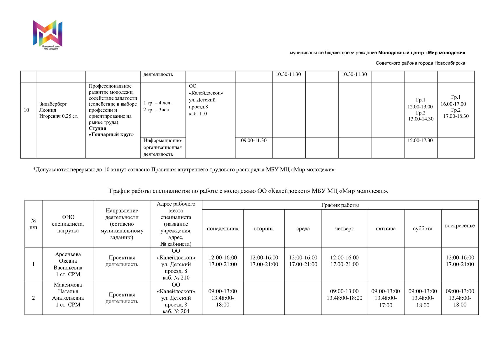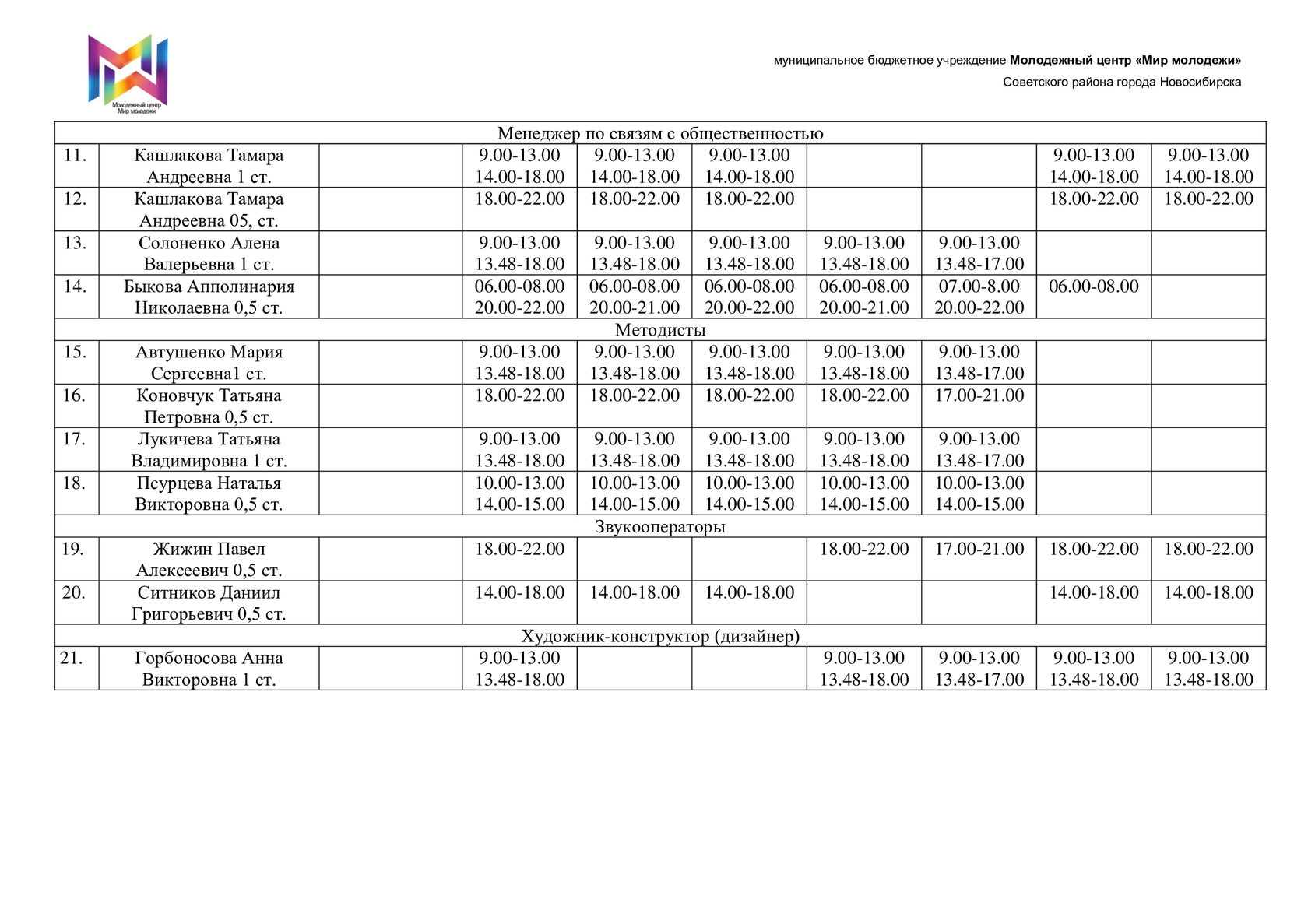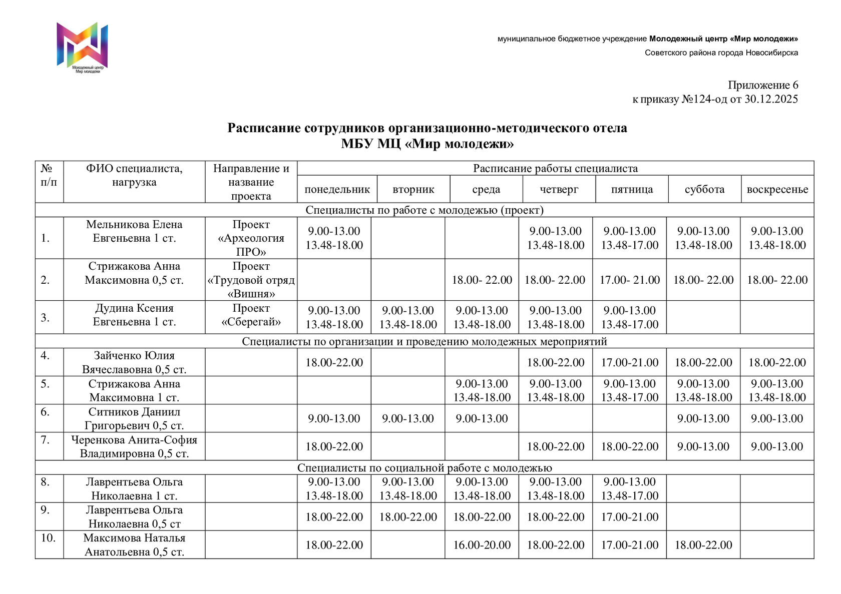 Расписание специалистов организационно-методического отдела