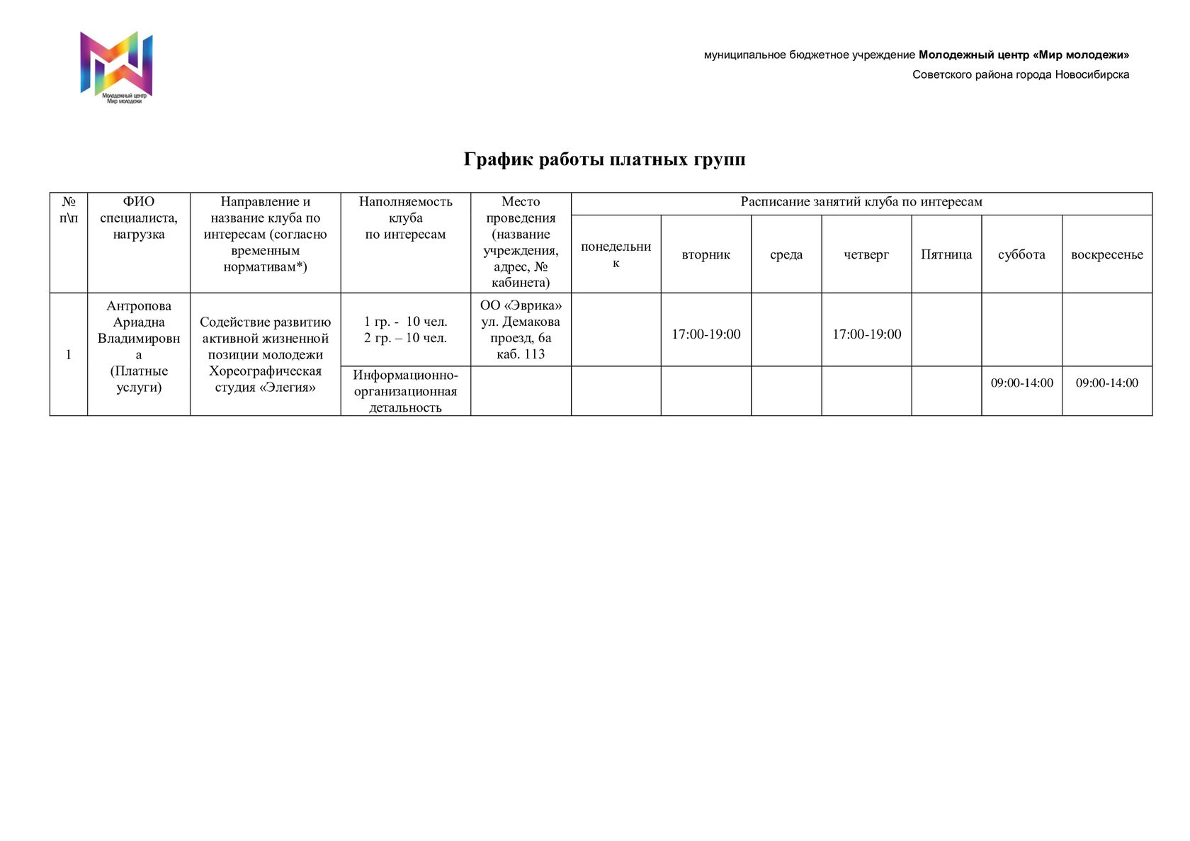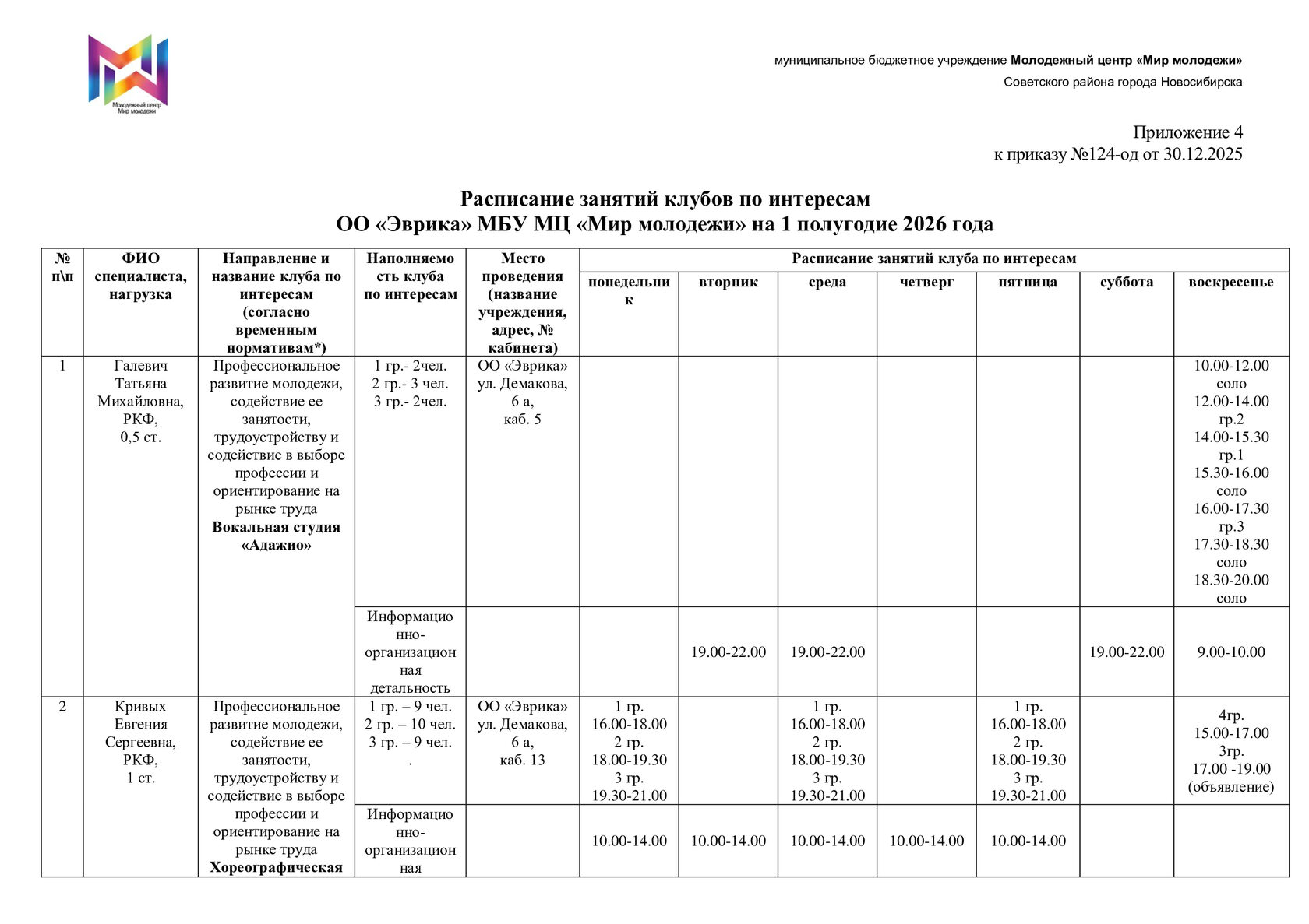 Расписание отдела "Эврика"